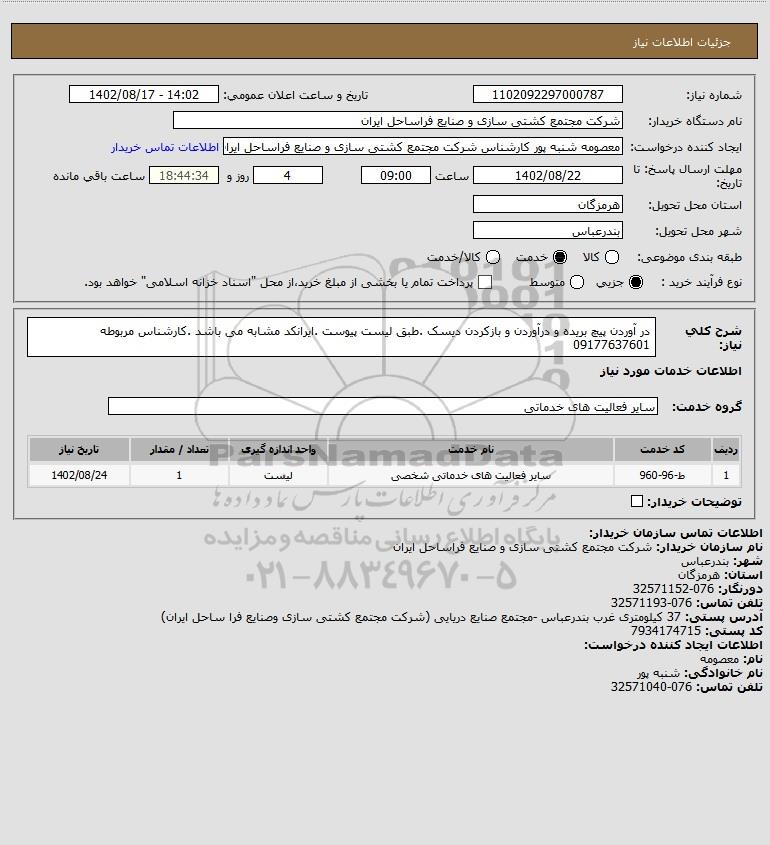 شرح کلی نیاز: در آوردن پیچ بریده و درآوردن و بازکردن دیسک .طبق لیست پیوست .ایرانکد مشابه می باشد .کارشناس مربوطه 09177637601