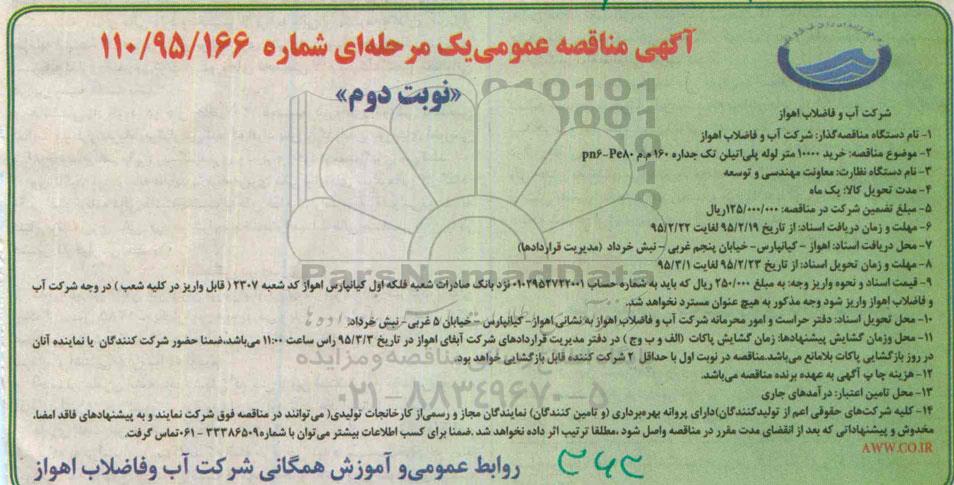 آگهی مناقصه عمومی یک مرحله ای شماره 166/95/110 نوبت دوم