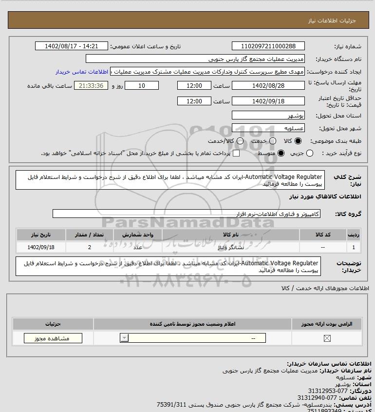 شرح کلی نیاز: Automatic Voltage Regulater-ایران کد مشابه میباشد ، لطفا برای اطلاع دقیق از شرح درخواست و شرایط استعلام فایل پیوست را مطالعه فرمائید