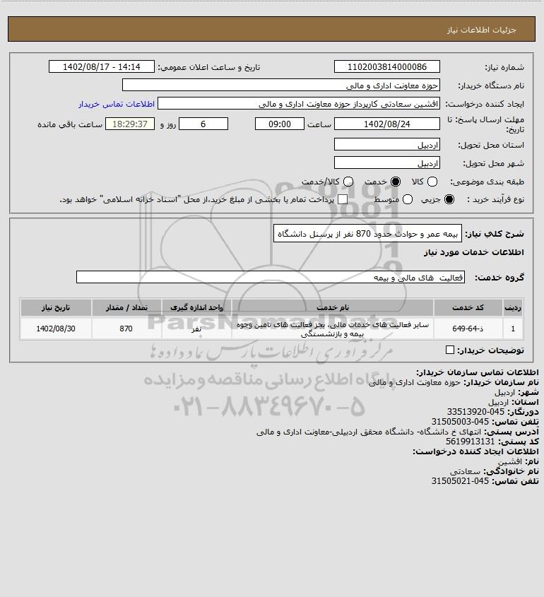 شرح کلی نیاز: بیمه عمر و حوادث حدود 870 نفر از پرسنل دانشگاه