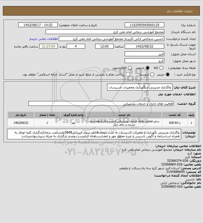 شرح کلی نیاز: واگذاری مدیریتی و نگهداری وتعمیرات تاسیسات
