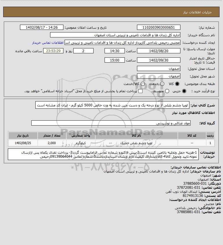 | 1 | -- | لوبیا چشم بلبلی خشک | کیلوگرم | 2,000 | 1402/08/25 |