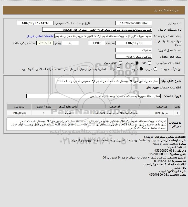 شرح کلی نیاز: معاینات پزشکی دوره ای پرسنل خدمات شهر شهرداری خمینی شهر در سال 1402