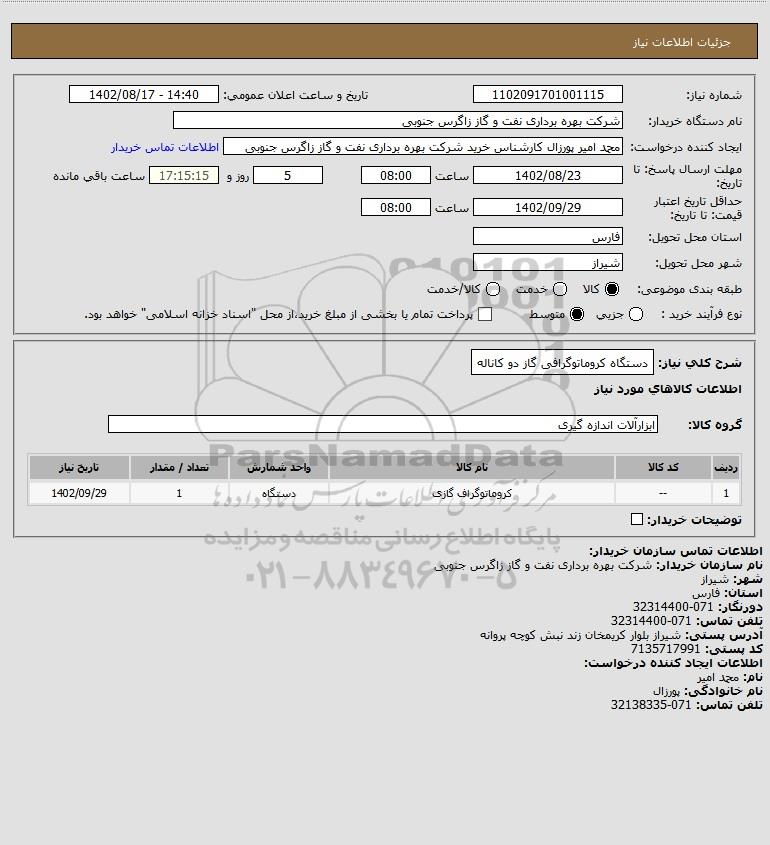 شرح کلی نیاز: دستگاه کروماتوگرافی گاز دو کاناله