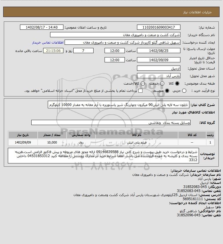 شرح کلی نیاز: نایلون سه لایه پلی اتیلن90 میکرون چهاررنگ شیر پاستوریزه با آرم مغانه به مقدار 10000 کیلوگرم