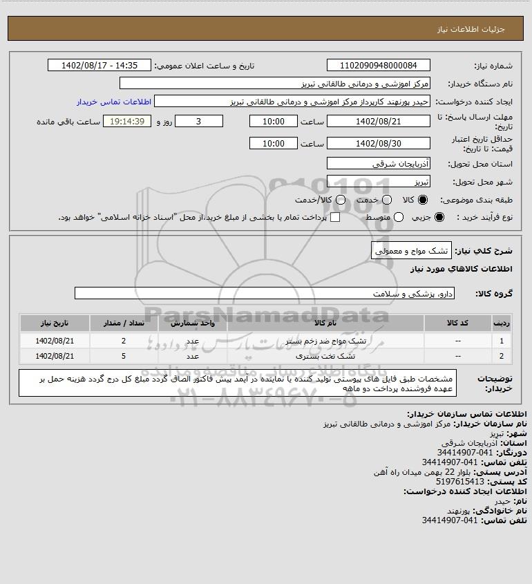 | 2 | -- | تشک تخت بستری | عدد | 5 | 1402/08/21 |