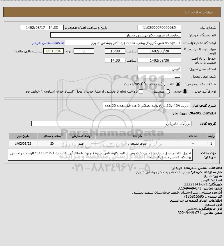 شرح کلی نیاز: باتری 12v 40A.تاریخ تولید حداکثر 6 ماه قبل.تعداد 20 عدد