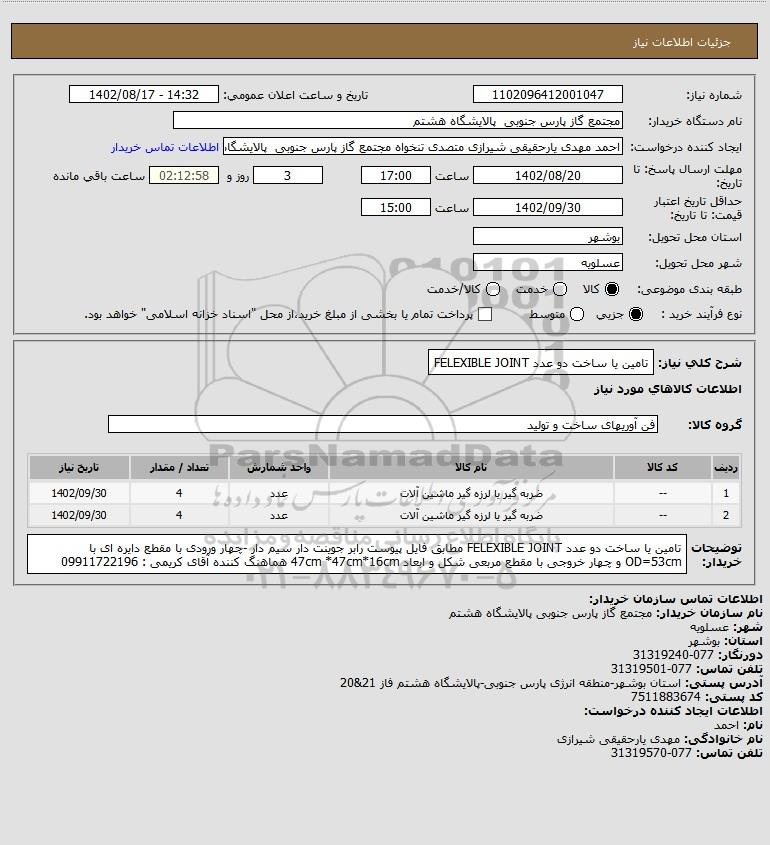 شرح کلی نیاز: تامین یا ساخت دو عدد FELEXIBLE JOINT