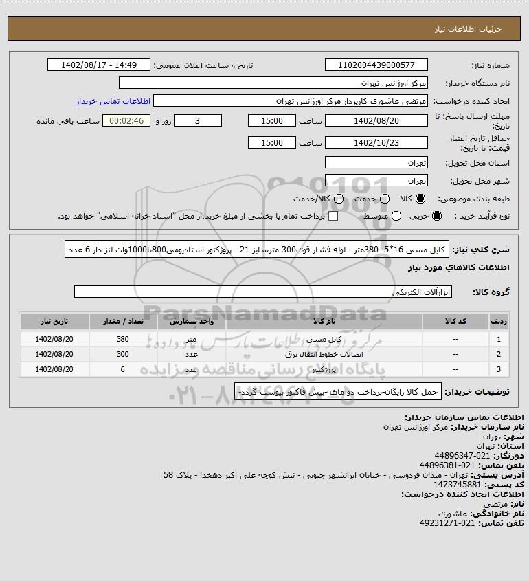 شرح کلی نیاز: کابل مسی 16*5 -380متر---لوله فشار قوی300 مترسایز 21---پروژکتور استادیومی800تا1000وات لنز دار 6 عدد
