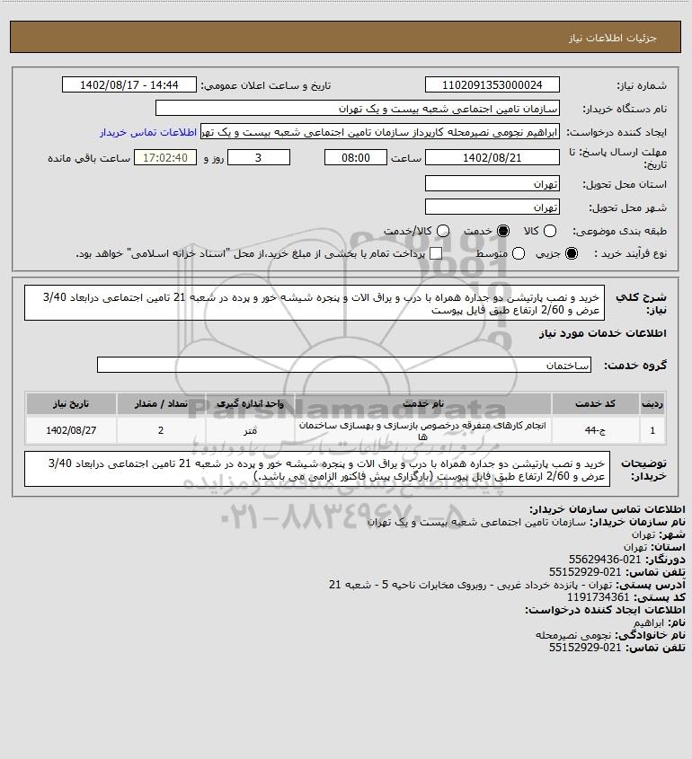 شرح کلی نیاز: خرید و نصب پارتیشن دو جداره همراه با درب و یراق الات و پنجره شیشه خور و پرده در شعبه 21 تامین اجتماعی درابعاد 3/40 عرض و 2/60 ارتفاع طبق فایل پیوست