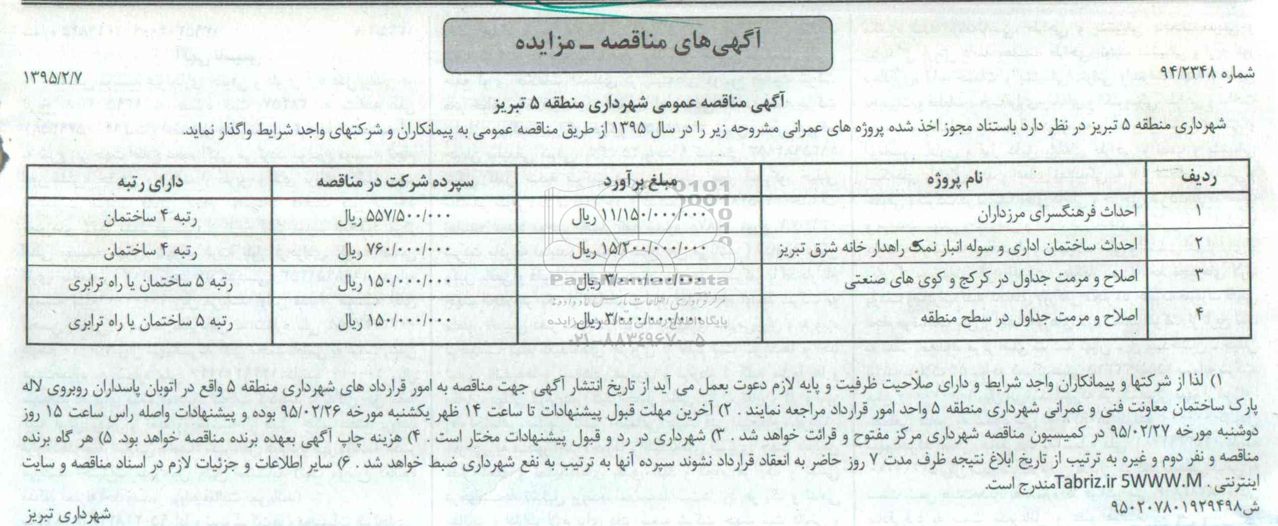 شهرداری منطقه 5 تبریز در نظر دارد باستناد مجوز اخذ شده پروژه های عمرانی مشروحه زیر را در سال 1395 از طریق مناقصه عمومی به پیمانکاران و شرکتهای واجد شرایط واگذار نماید .