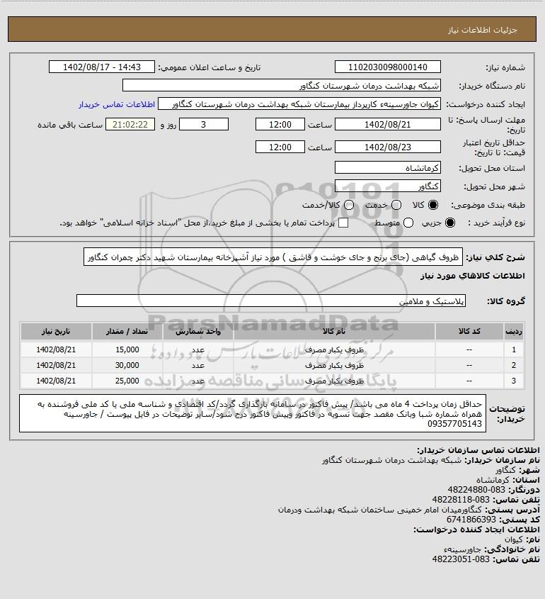 | 3 | -- | ظروف یکبار مصرف | عدد | 25,000 | 1402/08/21 |