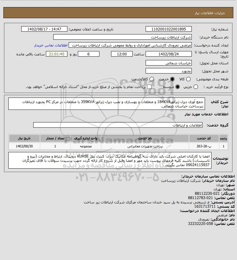 شرح کلی نیاز: جمع آوری دیزل ژنراتور184KVA و متعلقات و بهسازی و نصب دیزل ژنراتور 359KVA با متعلقات در مرکز PC بجنورد ارتباطات زیرساخت خراسان شمالی.