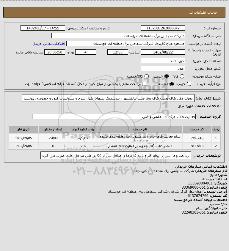 شرح کلی نیاز: دمونتاژدکل های پست های برق بعثت ماهشهر و بیدبلندیک بهبهان طبق شرح و مشخصات فنی و خصوصی پیوست