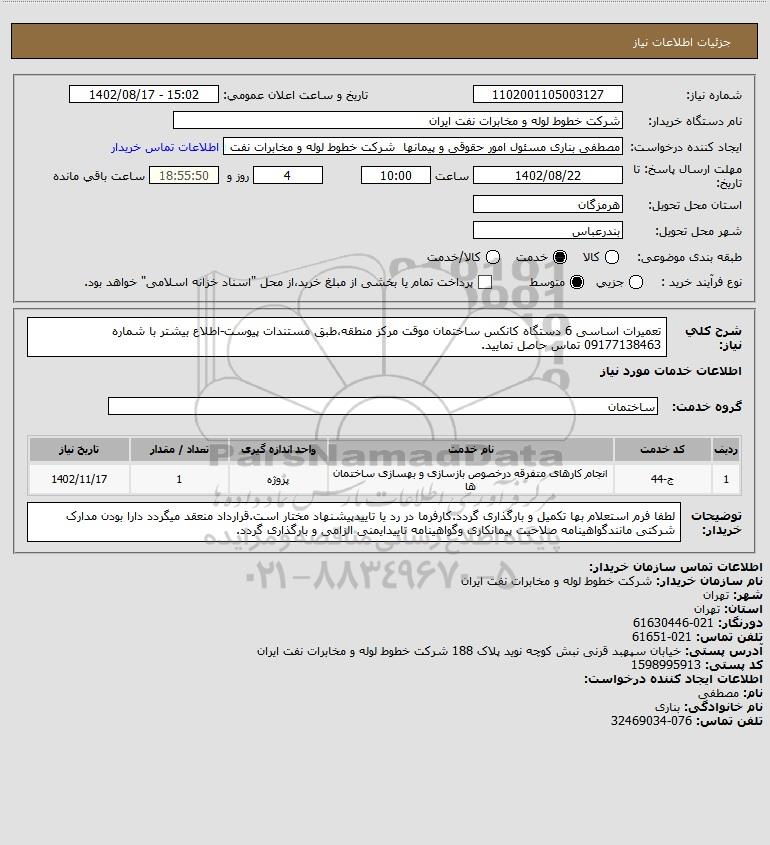 شرح کلی نیاز: تعمیرات اساسی 6 دستگاه کانکس ساختمان موقت مرکز منطقه،طبق مستندات پیوست-اطلاع بیشتر با شماره 09177138463 تماس حاصل نمایید.