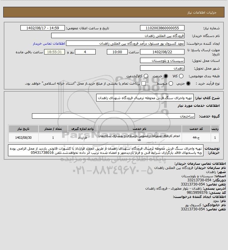 شرح کلی نیاز: تهیه واجرای سنگ فرش محوطه ترمینال فرودگاه شهدای زاهدان