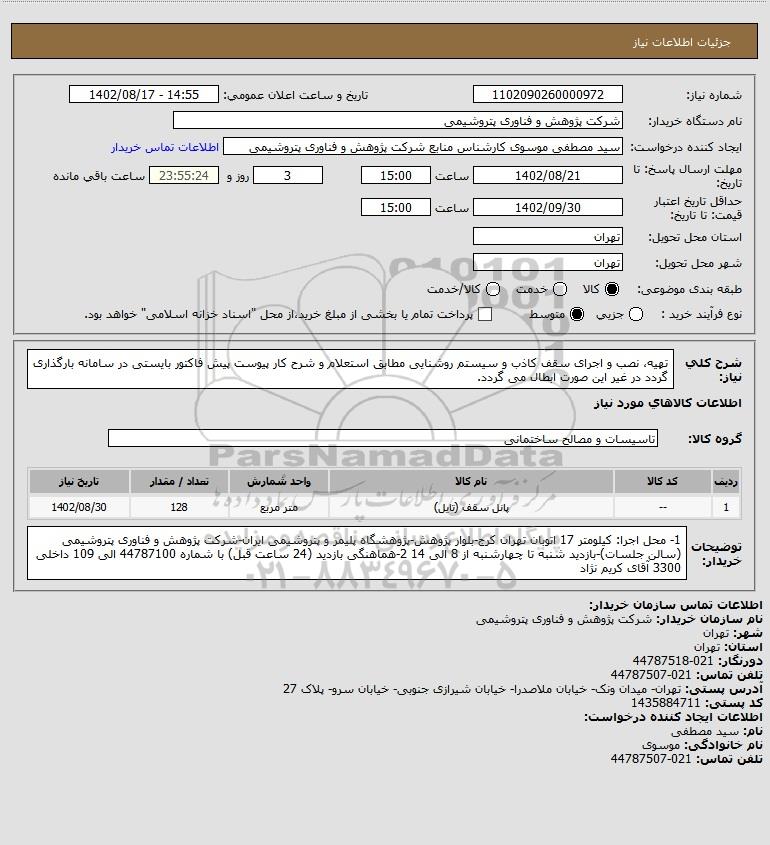| 1 | -- | پانل سقف (تایل) | متر مربع | 128 | 1402/08/30 |
