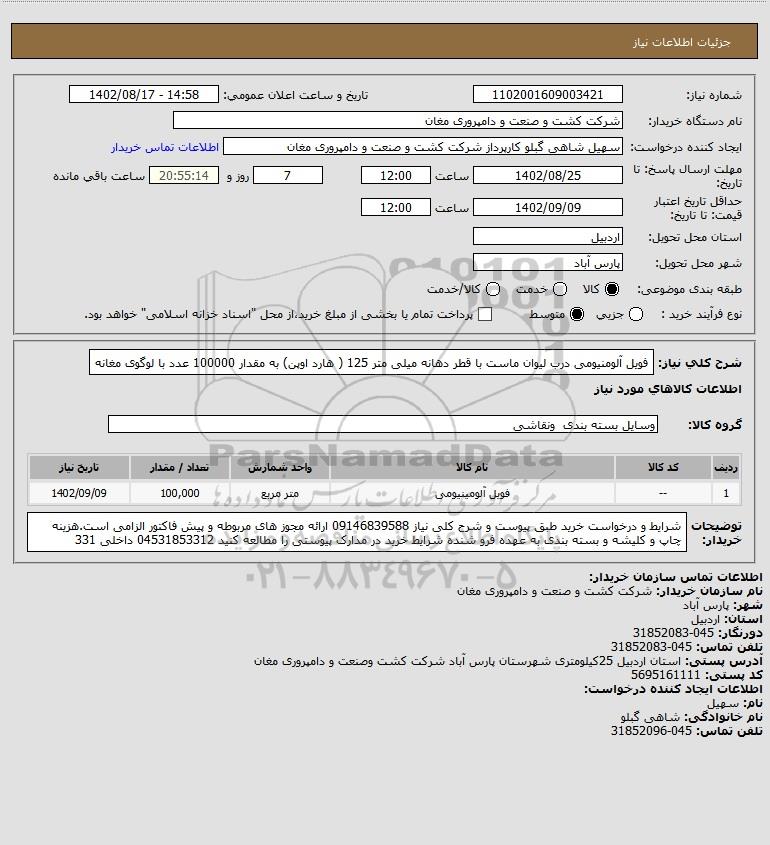 | 1 | -- | فویل آلومینیومی | متر مربع | 100,000 | 1402/09/09 |