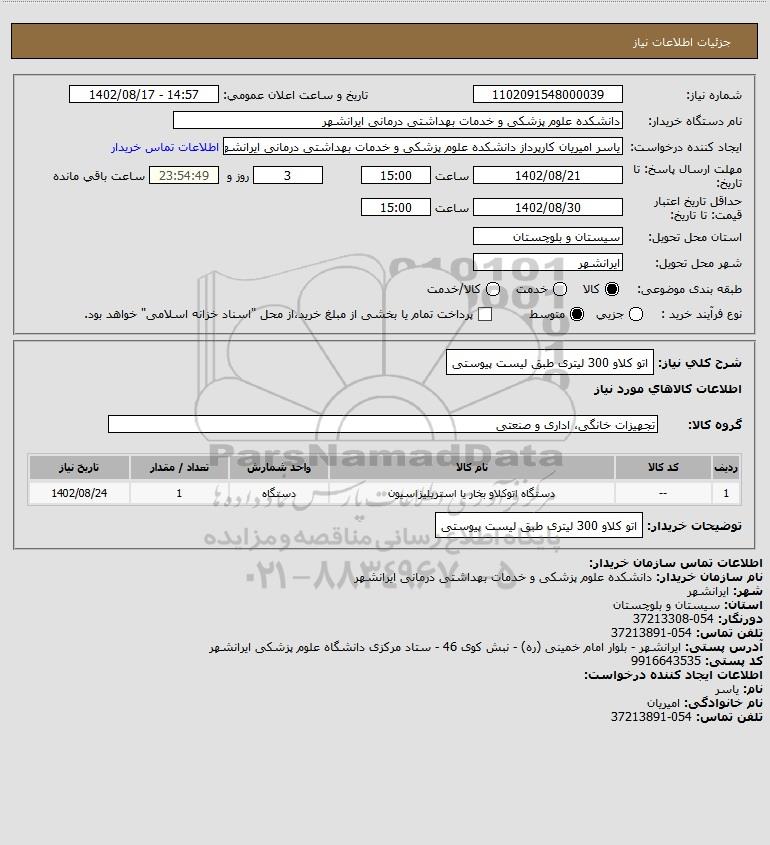 | 1 | -- | دستگاه اتوکلاو بخار یا استریلیزاسیون | دستگاه | 1 | 1402/08/24 |