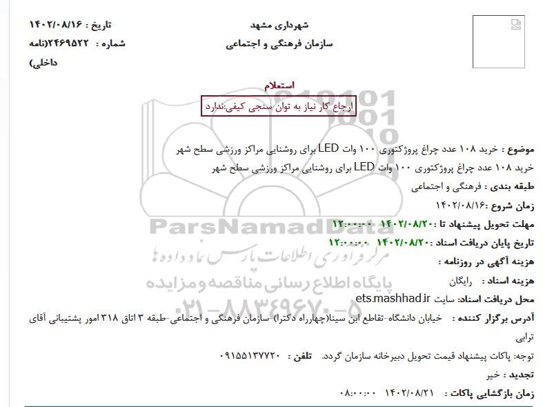 موضوع : خرید 108 عدد چراغ پروژکتوری 100 وات LED برای روشنایی مراکز ورزشی سطح شهر