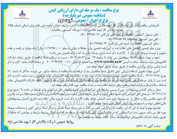 نام و نشانی مناقصه گزار: شرکت پالایش گاز شهید هاشمی نژاد (SGPC) به آدرس: مشهد، خیابان  آبکو، نبش دانشسرای شماره 255، شرکت پالایش گاز شهید هاشمی نژاد- دبیرخانه کمیسیون مناقصات