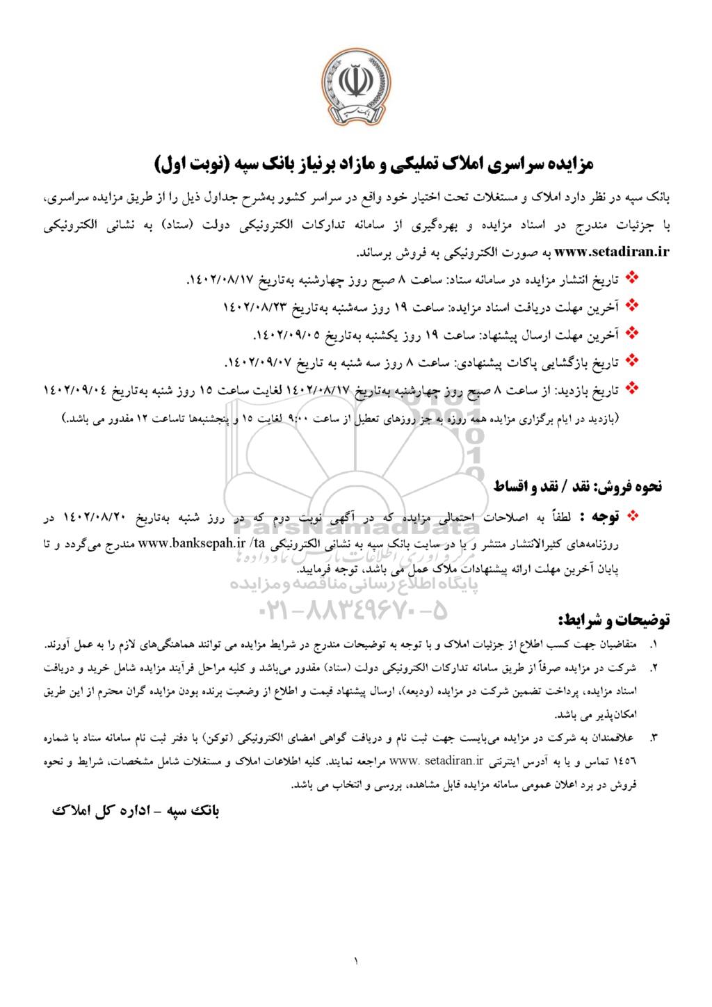 مزایده فروش املاک تملیکی و مازاد بر نیاز بانک سپه ؟