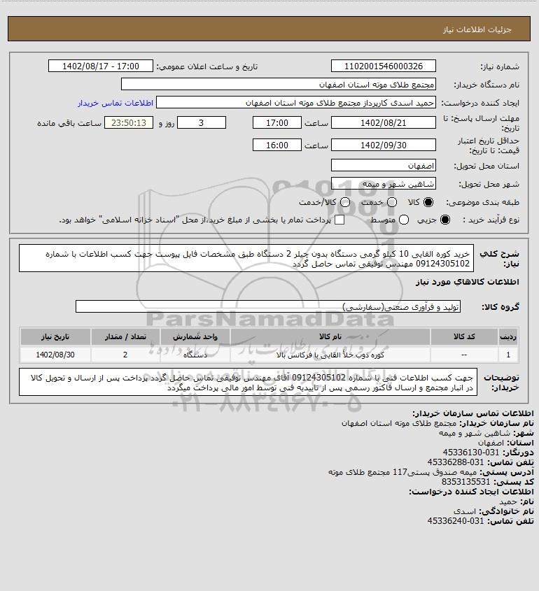 شرح کلی نیاز: خرید کوره القایی 10 کیلو گرمی دستگاه بدون چیلر 2 دستگاه طبق مشخصات فایل پیوست جهت کسب اطلاعات با شماره 09124305102 مهندس توفیقی تماس حاصل گردد
