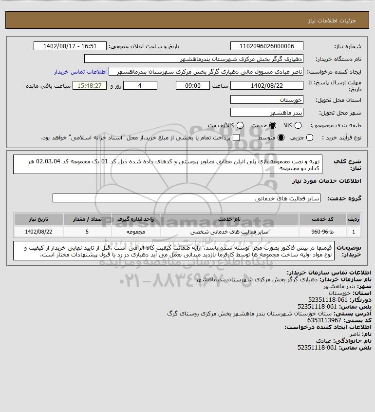 اسناد مناقصه استعلام تهیه و نصب مجموعه بازی پلی اتیلن مطابق تصاویر پیوستی و کدهای داده شده ذیل کد 01 یک مجموعه کد 02،03،04 هر کدام دو مجموعه به علت اتمام مهلت شرکت در مناقصه از روی وب سایت برداشته شده است. برای رویت اسناد جدید به صفحه اسناد مناقصه مزایده مراجعه کنید.