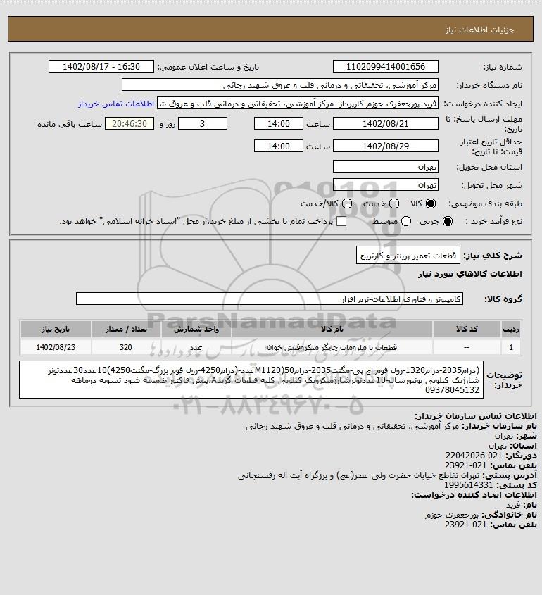 شرح کلی نیاز: قطعات تعمیر پرینتر و کارتریج