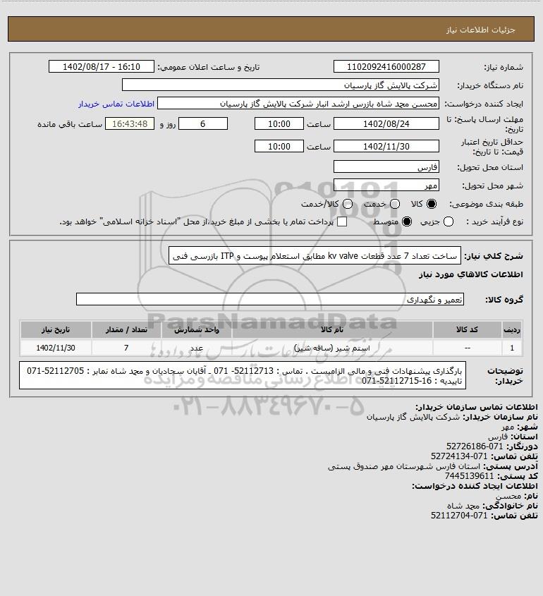 شرح کلی نیاز: ساخت تعداد 7 عدد قطعات kv valve مطابق استعلام پیوست و ITP بازرسی فنی