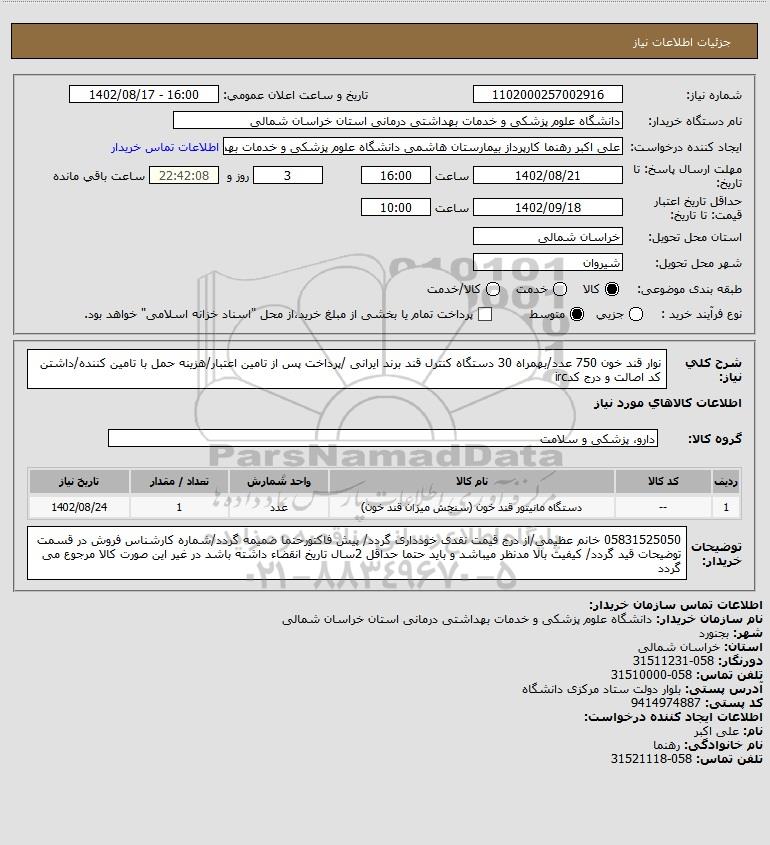 نام دستگاه خریدار:دانشگاه علوم پزشکی و خدمات بهداشتی درمانی استان خراسان شمالی