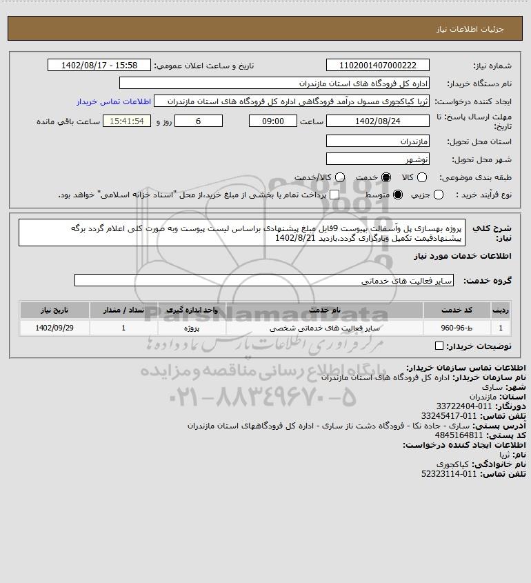 شرح کلی نیاز: پروژه بهسازی پل وآسفالت بپیوست 9فایل مبلغ پیشنهادی براساس لیست پیوست وبه صورت کلی اعلام گردد برگه پیشنهادقیمت تکمیل وبارگزاری گردد.بازدید 1402/8/21