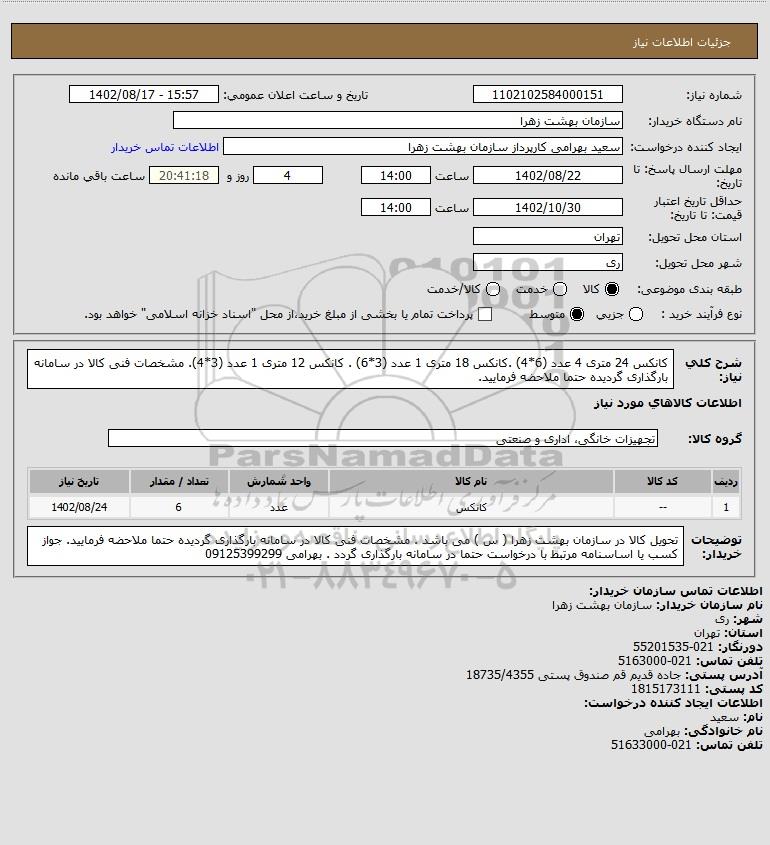 شرح کلی نیاز: کانکس 24 متری 4 عدد (6*4) .کانکس 18 متری 1 عدد (3*6) . کانکس 12 متری 1 عدد (3*4).