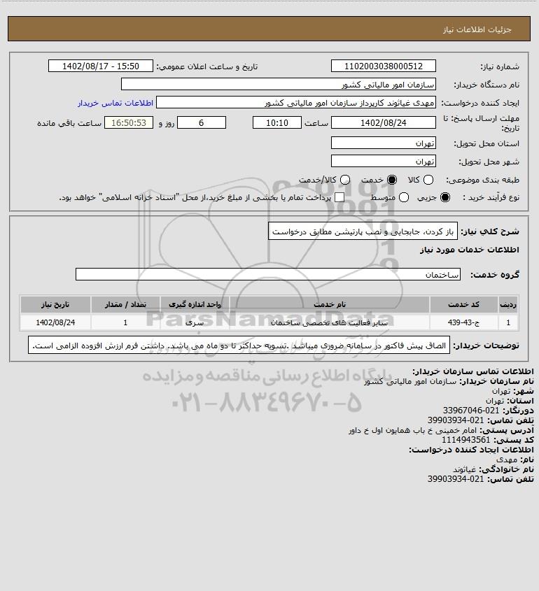 شرح کلی نیاز: باز کردن، جابجایی و نصب پارتیشن مطابق درخواست