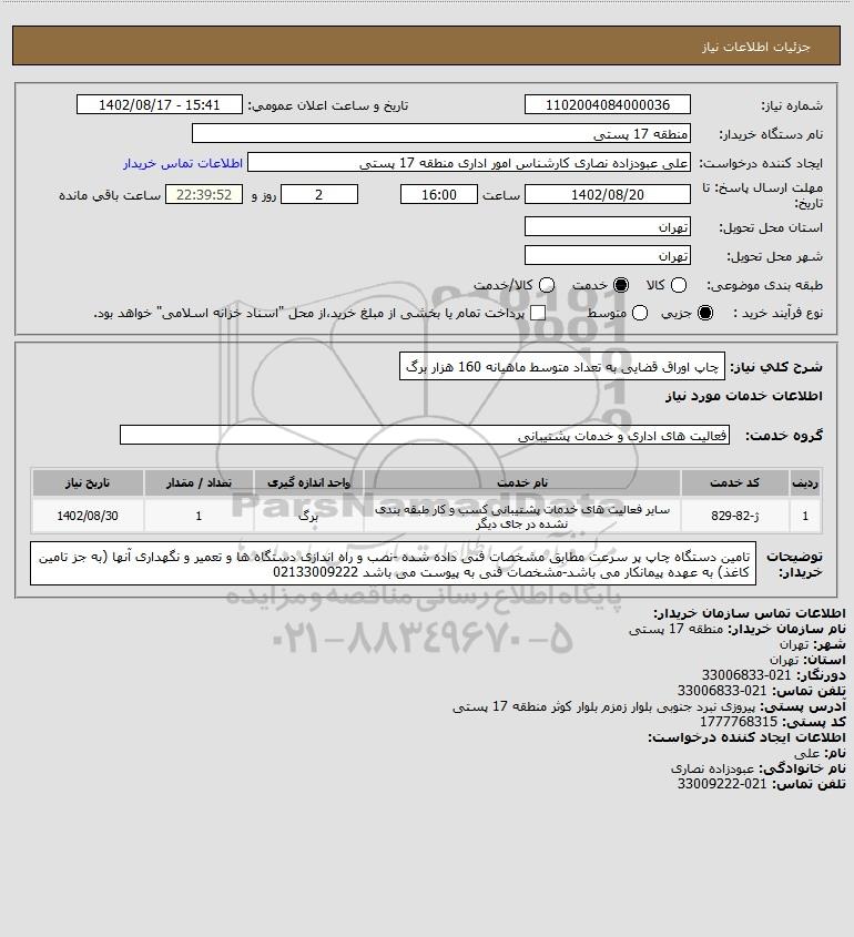 شرح کلی نیاز: چاپ اوراق قضایی به تعداد متوسط ماهیانه 160 هزار برگ