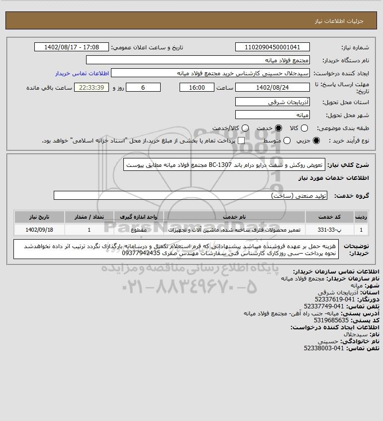 شرح کلی نیاز: تعویض روکش و شفت درایو درام باند BC-1307 مجتمع فولاد میانه مطابق پیوست