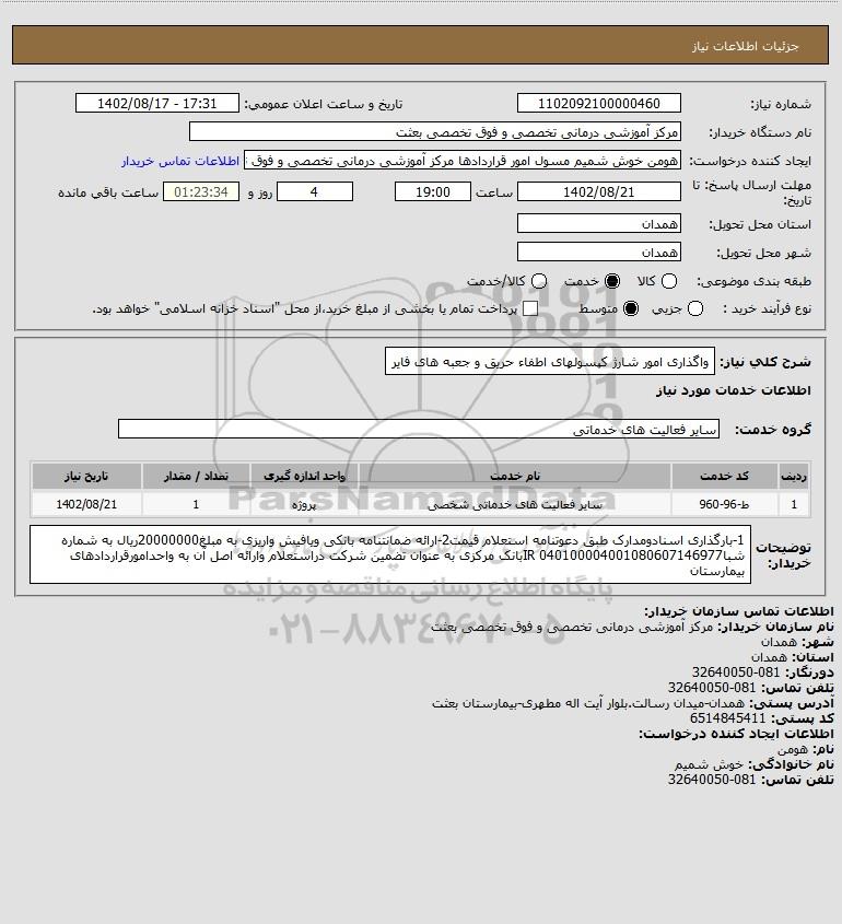 شرح کلی نیاز: واگذاری امور شارژ کپسولهای اطفاء حریق و جعبه های فایر