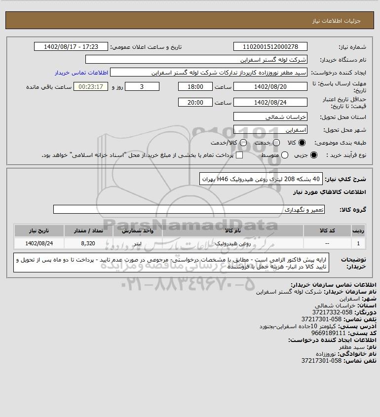 شرح کلی نیاز: 40 بشکه 208 لیتری روغن هیدرولیک H46 بهران