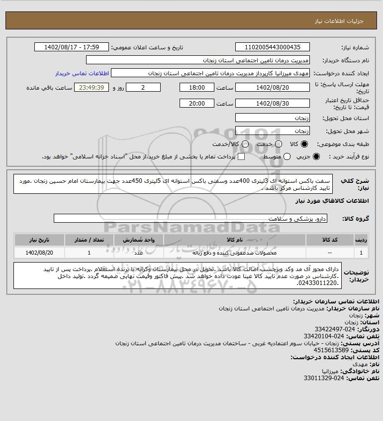شرح کلی نیاز: سفت باکس استوانه ای 3لیتری 400عدد وسفتی باکس استوانه ای 5لیتری 450عدد جهت بیمارستان امام حسین زنجان .مورد تایید کارشناس مرکز باشد .