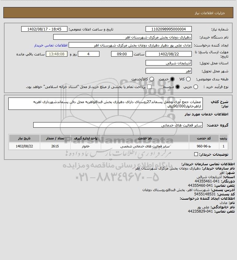 شرح کلی نیاز: عملیات جمع آوری وحمل پسماند27روستای دارای دهیاری بخش فندقلواهربه محل دفن پسماندشهرداری اهربه ازاهرخانوار90/000ریال