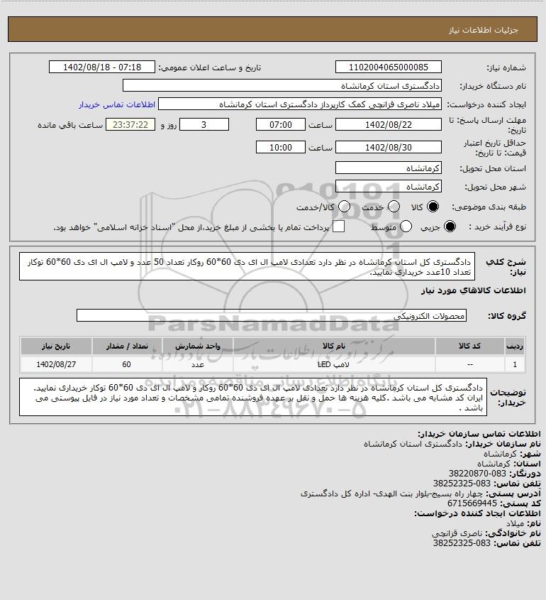 شرح کلی نیاز: دادگستری کل استان کرمانشاه در نظر دارد تعدادی لامپ ال ای دی 60*60 روکار تعداد 50 عدد و لامپ ال ای دی 60*60 توکار تعداد 10عدد خریداری نمایید.