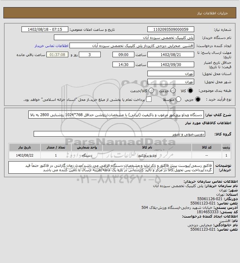 شرح کلی نیاز: دستگاه ویدئو پروژکتور مرغوب و باکیفیت (ایرانی) با مشخصات:رزولشن حداقل 768*1024 روشنایی 2800 به بالا