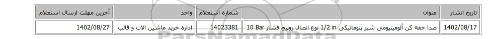 | 1402/08/17 | صدا خفه کن آلومینیومی شیر پنوماتیکی 1/2 in نوع اتصال روپیچ فشار 10 Bar | 14023381 | اداره خرید ماشین الات و قالب | 1402/08/27 |