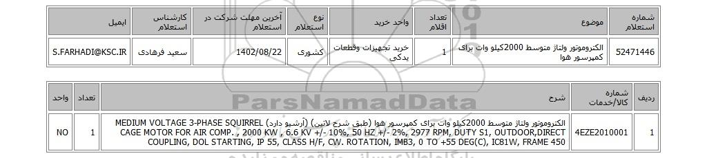 | 52471446 | الکتروموتور ولتاژ متوسط 2000کیلو وات برای کمپرسور هوا | 1 | خرید تجهیزات وقطعات یدکی | کشوری | 1402/08/22 | سعید فرهادی | S.FARHADI@KSC.IR |