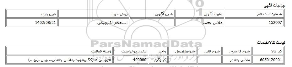 | 152997 | ملاس چغندر | استعلام الکترونیکی | 1402/08/21 |
