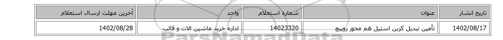 | 1402/08/17 | تأمین تبدیل کربن استیل هم محور روپیچ | 14023320 | اداره خرید ماشین الات و قالب | 1402/08/28 |