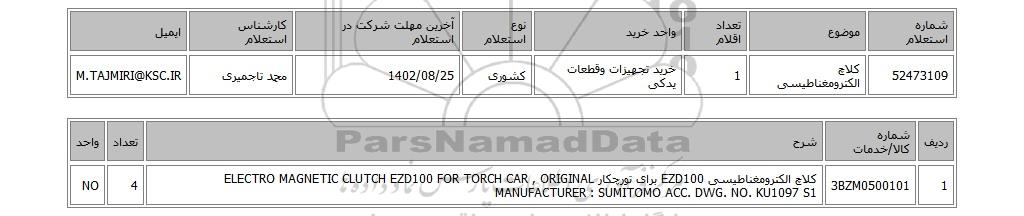 | 52473109 | کلاچ الکترومغناطیسی | 1 | خرید تجهیزات وقطعات یدکی | کشوری | 1402/08/25 | محمد تاجمیری | M.TAJMIRI@KSC.IR |