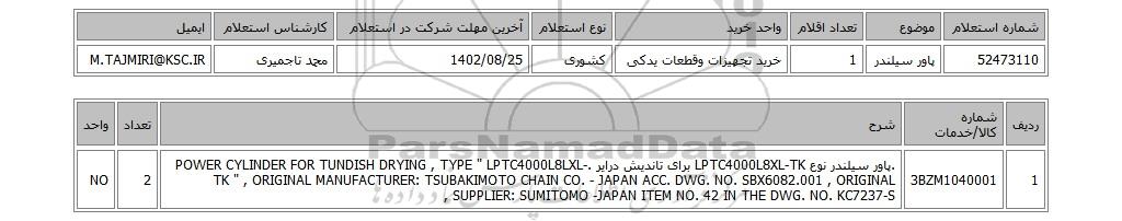 | 52473110 | پاور سیلندر | 1 | خرید تجهیزات وقطعات یدکی | کشوری | 1402/08/25 | محمد تاجمیری | M.TAJMIRI@KSC.IR |