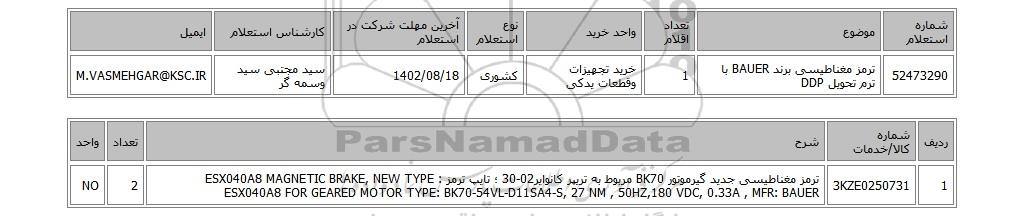 52473290ترمز مغناطیسی برند BAUER با ترم تحویل DDP 1خرید تجهیزات وقطعات یدکیکشوری1402/08/18سید مجتبی سید وسمه گرM.VASMEHGAR@KSC.IR