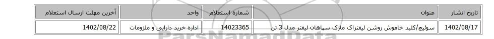 1402/08/17سوئیچ/کلید ‎خاموش روشن لیفتراک مارک سپاهان لیفتر مدل 3 تن14023365اداره خرید دارایی و ملزومات1402/08/22